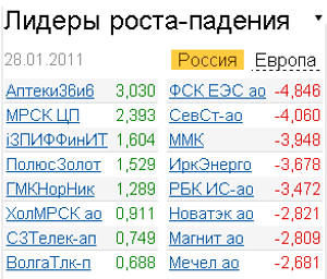 В фаворитах оказались акции "Полюс золото". В пятницу компания представила производственные результаты за 2010 год и озвучила планы на 2011 год. На этом фоне данные бумаги выросли в цене на 1,53%. По мнению экспертов, активность "быков" в этих бумагах может сохраниться.