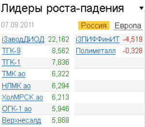 Особым интересом инвесторов пользовались бумаги сильно подешевевшие бумаги территориальных генерирующих компаний. По итогам дня акции ТГК-1 прибавили 7,8%, ТГК-9 в плюсе на 8,6%. В ожидании обратного выкупа на 2,5% выросли бумаги "Норникеля". Аналитик ГК "АЛОР" Наталья Лесина прогнозирует, что инвесторы продолжат скупку, поскольку цена buyback может быть выше 9 тысяч рублей за акцию. Хорошие новости по "Северному потоку" позволили подорожать на 3,6% "Газпрому".