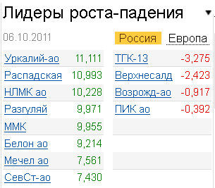 Лидерами нынешнего роста стали бумаги "сырьевиков": "Газпром" (+5,27%), "Роснефть" (+5,71%), "Уралкалий" (+11,11%) и "Распадская" (+10,99%). Как отмечает старший аналитик ИК "Норд-Капитал" Роман Ткачук, поводом для покупок в акциях угольного гиганта стало сообщение о том, что Александр Фролов, президент "ЕВРАЗа", отказывается о продажи своей части компании.