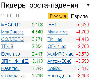 В течение дня лучше рынка чувствовали себя привилегированные акции "Сбербанка" (+ 1,13%). Банк представил отчетность за 9 месяцев 2011 года по РСБУ. Чистая прибыль компании за 9 месяцев 2011 года по РСБУ выросла в 2,4 раза - до 254,3 миллиарда рублей.