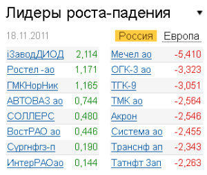 Отечественные "фишки" в подавляющем большинстве завершили торговую сессию в "красном поле". Возглавили список аутсайдеров бумаги "Мечела" (-5,4%), ОГК-3 (-3,3%), ТГК-9 (-3%), ТМК (-2,5%). Покупатели оказались сильны на момент закрытия в акциях "Ростелекома" (+1,1%), "Норникеля" (+1,1%), "АВТОВАЗа" (+0,7%), "СОЛЛЕРСа" (+0,4%).