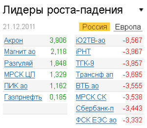 В лидерах снижения были акции банков: ВТБ (-3,55%), "Сбербанк" (-3,01%), "Сбербанк" пр. (-3,44%). Сообщение главы "Сбербанка" Германа Грефа о том, что приватизация 7,6% банка с большой вероятностью произойдет после выборов президента в марте 2012 года, могло немного разочаровать инвесторов. Предыдущий рост в 4% акций "Газпрома", связанный с новостью о высоких дивидендах за 2011 год, в среду перешел в снижение, по итогам торгов бумаги потеряли 1,6%. "С учетом того, что до закрытия реестра времени еще очень много, игра на повышение уступает место коррекции вслед за изменением внешнего фона", - отмечает Александр Потавин. НМТП сегодня обнародовал финансовые результаты по МСФО за 9 месяцев 2011 года, продемонстрировав падение чистой прибыли в 7,2 раза. В целом результаты оказались даже чуть выше ожиданий рынка, но все же бумаги компании по итогам торгов потеряли 1,61%. Среди растущих бумаг выделялись в течение дня бумаги "Акрона" (+3,9%), "Магнита" (+2,12%). Выкуп "Уралкалием" (-0,55%) собственных акций удерживал бумаги компании на плаву.