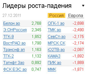 Энергетический сектор продолжает страдать от распродаж. Более других продажам подверглись бумаги ОГК-1 (-2,7%), "МРСК СК" (-2,17%), ОГК-2 (-1,47%). А предыдущие лидеры снижения, наоборот, откупались, и по итогам дня бумаги ОГК-5 подросли на 0,23%, а "Э.ОН Россия" потяжелели на 2,34%. Кроме того, покупатели обратили взор на акции "РАО ЭС Востока" (+1,79%), чему способствовали новости от самой компании. В 2011 году на реализацию инвестиционной программы холдинг направил более 21 миллиарда рублей, что более чем на 30% выше показателей 2010 года. Кроме того, с опережением графика реализуется проект по технологическому присоединению точек связи автодороги федерального значения Чита-Хабаровск. Не менее уверенный рост показали бумаги "ФСК ЕЭС" (+0,75%), ТГК-2 (+1,13%) и ТГК-9 (+1,85%).