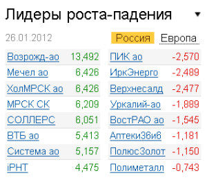 На фоне заявлений ФРС отлично смотрелся на российском рынке банковский сектор. Вырвался вперед банк "Возрождение". Его акции на закрытие демонстрировали рост на 13,49%. Бумаги банка ВТБ выросли на 5,41% - глава банка заявил, что дивиденды за 2011 год составят 10-20% от чистой прибыли, как было и за 2010 год. Продолжили восходящее шествие и акции "Сбербанка". Его "обычки" прибавили в четверг 3,84%.