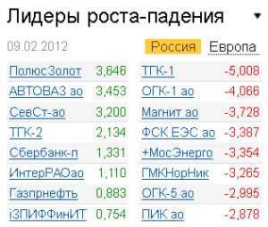 Среди российских компаний в центре внимания оказался банк ВТБ - разрешилась интрига по выкупу его акций у миноритариев. Стало известно, что цена выкупа акций банка у участников "народного IPO" составит 13,6 копейки за бумагу. Кроме того, премьер-министр РФ Владимир Путин на съезде РСПП сообщил, что ВТБ будет выкупать акции у миноритариев, принявших участие в "народном IPO", в марте-апреле 2012 года. Максимальный объем выкупа, по расчетам банка, составит примерно 16 миллиардов рублей, предельное снижение капитала группы ВТБ - не более 7-8 миллиардов рублей. Однако игроков, торгующих бумагами банка, эти новости не вдохновили. Акции ВТБ демонстрировали значительное снижение. По итогам сессии они потеряли 1,55%.