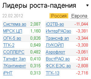 Лучше рынка смотрелись акции отечественных автопроизводителей: бумаги "КАМАЗа" и "АВТОВАЗа" выросли по итогам торгов на 0,19% и 0,16% соответственно. Также повышенным спросом пользовались бумаги АФК "Система" (+2,08%), "МРСК Центра и Приволжья" (+1,16%), ОГК-5 (+0,82%). В аутсайдерах торгов находились бумаги "О2ТВ" (-11,04%), "ИНТЕР РАО ЕЭС" (-3,38%), "Транснефти" (-3,34%), "Аэрофлота" (-3,06%). В очередной раз ощутимое снижение произошло в бумагах "ЛУКОЙЛа", потерявших по итогам торгов 3,3%. "Сложно судить, новости или что-то еще служит причиной такой динамики", - отмечает начальник отдела аналитических исследований ИК "УНИВЕР Капитал" Дмитрий Александров. Так же активные распродажи были и в "Роснефти" (-1,18%).
