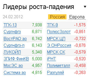 На фоне дорожающей нефти в авангарде роста расположились обыкновенные и привилегированные акции "Сургутнефтегаза", прибавившие почти по 7%. Большой популярностью пользуются и АДР на эти акции (+6,3%). Эксперты связывают покупки с высокими ожиданиями по дивидендным выплатам. В это время "ЛУКОЙЛ" подорожал на 5,3%, "Роснефть" - на 4%, "Газпром" - на 3,7%. Активно покупали инвесторы и акции банков: ВТБ (+4%), "Сбербанк" (+3%). Хуже рынка торговались бумаги ТГК-9 (-1,6%), "Полюс Золото" (-0,9%), а также чуть выправившиеся к финалу сессии акции "Транснефти" (+0,3%).