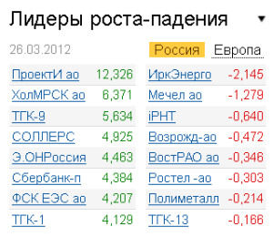 Акции энергетических компаний торговались разнонаправленно. Лидерами роста в сегменте стали: "Холдинг МРСК" (+6,28%), "ФСК ЕЭС" (+4,24%), "ИНТЕР РАО ЕЭС" (+0,1%). Бумаги "Э.ОН Россия" прибавили в цене 3,76% на хорошей отчетности: чистая прибыль компании по РСБУ в 2011 году выросла на 45% - до 15 миллиардов рублей. Наименьшим спросом пользовались бумаги ТГК-13 (-0,17%), "Иркутскэнерго" (-2,14%).