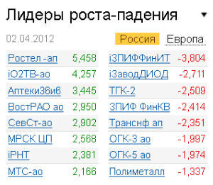 В лидеры роста выбились акции "Северстали"(+2,9%), которые оптимистично отреагировали на значительный рост фьючерсов на промметаллы. Также лучше рынка смотрелись акции "Ростелекома" (+5,46%), что вызвано началом второго этапа реорганизации - присоединением "Связьинвеста". Отличились повышением котировок и бумаги "Аптеки 36и6" (+3,45%), ВТБ(+2.06%), "МРСК Центра и Приволжья" (+2,57%).