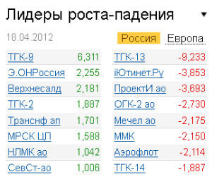Аутсайдерами торгов стали акции "Мечела" (-2,17%), ММК (-2,15%), "Аэрофлота" (-2,11%), "ФСК ЕЭС" (-1,65%), ВТБ (-0,06%). Бумаги "Магнитогорского металлургического комбината" просели в связи с публикацией финансовой отчетности по МСФО за 4-й квартал и 12 месяцев 2011 года. Несмотря на годовой прирост выручки на 21%, с учетом разовых факторов снижения прибыли группа ММК получила чистый убыток в размере 125 млн долларов США.