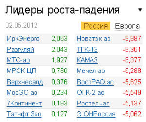 Бумаги "Роснефти" большую часть торговой сессии росли в ожидании финансовой отчетности по МСФО. Однако результаты компании не оправдали надежды участников рынка: согласно отчету, чистая прибыль за 1-й квартал 2012 года снизилась на 8,9% - до 112 миллиардов рублей. Кроме того, хуже рынка выглядели акции отечественных автопроизводителей. Бумаги "АВТОВАЗа" (-0,13%) снижались в свете сокращения продаж автомобилей в России на 14% - до 159,5 тысячи автомобилей. Акции "КАМАЗа" (-6,38%) находились в перекупленном состоянии, что стало техническим основанием для их коррекции сегодня.