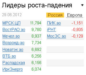 По итогам дня аутсайдерами торгов на объединенной бирже ММВБ-РТС стали отдельные акции электроэнергетического сектора: "Мосэнергосбыт" (-0,1%), "МосТСК" (-0,7%). Набирает обороты конфликт в UC Rusal. Sual Partners Виктора Вексельберга и Леонарда Блаватника потребовала провести внеочередное собрание акционеров "РУСАЛа", чтобы внести изменения в устав компании. Результатом поправок может стать предоставление отдельным директорам права передавать решение по сделкам с заинтересованностью на одобрение акционерам. Собрание акционеров "РУСАЛа" пройдет 3 августа 2012 года. РДР металлургической компании на бирже в Гонконге снизились на 0,89%.
