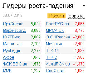 Лучше рынка в течение дня смотрелись и акции "СОЛЛЕРСа" (-0,02%), поводом для покупок которых послужили новости о росте продаж компании более чем на 20% в 1 полугодии текущего года. Пользовались спросом также бумаги "Аэрофлота", выросшие по итогам торгов на 0,74%. Авиаперевозчик сообщил о росте пассажиропотока за 5 месяцев 2012 года на 27,8% - до 6,33 миллиона человек. Компания "Трансаэро" сообщила о росте чистой прибыли в 1 полугодии 2012 года на 40,5% - до 159,7 миллиона рублей. Однако бумаги эмитента снизились на 0,33%.