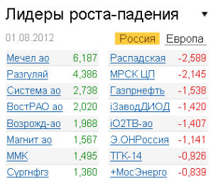 В лидерах роста на российском рынке оказались акции "Разгуляя" (+4,38%), АФК "Система" (+2,74%), "РАО ЭС Востока" (+2,02%). Среди растущих бумаг по-прежнему привлекали внимание акции "Магнита" (+1,57%), которые продолжили рост после хорошей отчетности. Иван Фоменко, начальник отдела доверительного управления "Абсолют Банка", рекомендует инвесторам быть предельно осторожными, поскольку объемы торгов в бумагах ритейлера снижаются. Продемонстрировали повышение и акции "металлургов": НЛМК (+0,68%), "Северсталь" (+0,55%), "Мечел" (+6,19%). Акции последнего подскочили на фоне сильных производственных результатов компании за 1 полугодие: добыча угля "Мечела" выросла на 7% - до 13,4 миллиона тонн. Бумаги "ЛУКОЙЛа" (+0,48%) пользовались спросом благодаря новости о том, что компания создала три альянса с норвежскими НК для получения лицензии на разработку шельфа Баренцева моря.