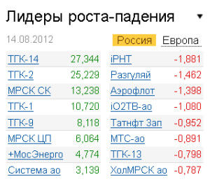 Фаворитами дня стали бумаги нескольких теплогенерирующих компаний: ТГК-14 (+27,3%), ТГК-2 (+25,68%), ТГК-1 (+10,56%), ТГК-9 (+8,1%). Аналитики объясняют интерес к этим бумагам тем, что они очень подешевели за последнее время, а кроме того эти акции низколиквидные и даже небольшой спрос на них может вызывать сильные движения. Компанию названным ТГК в группе лидеров составили также акции "МРСК Северного Кавказа"(+13,2%), "МРСК Центра и Приволжья" (+6%), "Мосэнерго" (+4,6%), "АФК "Система" (+3,1%). В аутсайдерах завершили торговую сессию вторника бумаги "Разгуляя" (-1,4%), "Аэрофлота" (-1,3), "Татнефти" (-0,9%), МТС (-0,8%).