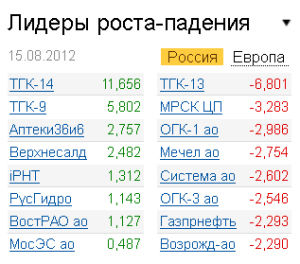 По итогам дня аутсайдерами торгов стали бумаги АФК "Система" (-2,6%), "Газпром нефти" (-2,29%), "Иркутскэнерго" (-2,2%), ММК (-2,14%), "ФСК ЕЭС" (-2,1%), "Северстали" (-2,09%). Поводом для снижения акций "Северстали" стала публикация финансовой отчетности по РСБУ за 1 полугодие 2012 года. За отчетный период чистая прибыль компании снизилась на 24%, до 12,24 миллиарда рублей.