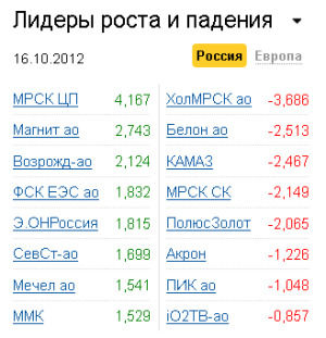 Тем не менее, к вечеру количество покупок на российских площадках возросло, и по итогам дня индекс ММВБ подрос к закрытию на 0,87% - до уровня 1456,07 пункта, РТС финишировал в плюсе 1,45% на отметке 1488,16 пункта. Лучше рынка выглядели во вторник бумаги "МРСК Центра и Приволжья" (+4,1%), "Магнита" (+2,7%), банка "Возрождение" (+2,1%), "ФСК ЕЭС" (+1,8%), "Э.ОН Россия" (+1,8%), "Северстали" (+1,6%), "Мечела" (+1,5%), ММК (+1,5%). Аутсайдерами дня стали акции "Холдинга МРСК" (-3,6%), "Белона" (-2,5%), "КАМАЗа" (-2,1%) и "МРСК Северного Кавказа" (-2,1%), "Полюс Золото" (-2%).