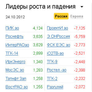 Также в лидерах рынка пребывали обыкновенные акции "Группы ПИК" (+4,12%) и бумаги ТГК-14 (+2,89%), "Иркутскэнерго" (+1,34%), "Татнефти" (+1.26%). Лучше рынка торговалось и "ИНТЕР РАО ЕЭС" (+3,63%), объявившее принудительный выкуп акций "Петербургской сбытовой компании".