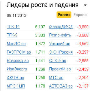 Из внутренних корпоративных новостей стоит отметить отчет "НОВАТЭКа" по МСФО за 9 месяцев 2012 года. Компания увеличила чистую прибыль на 24% - до 50,9 миллиарда рублей. Котировки акций по итогам дня выросли на 0,17%. НЛМК снизил чистую прибыль за 9 месяцев 2012 года по US GAAP на 49% - до $617,4 миллиона. В итоге бумаги закрыли день снижением на 0,7%. Распродажам подверглись также акции "Газпром нефти" (-3,9%), "Уралкалия"(-3,5%), МТС (-2,2%). В лидерах роста находились бумаги "Газпрома" (+1,7%), "ИркутскЭнерго" (+1,2%), ТГК-14 (+6,1%), "Мосэнерго" (+1,8%).