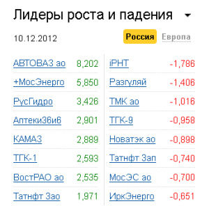 Также лучше рынка торговались "Мосэнерго" (+5,85%), "Аптечная сеть 36 и 6" (+2,90%),"КАМАЗ" (+2,89%), ТГК-1 (+2,59%), "Норникель" (+1.51%). Хуже рынка смотрелись бумаги ТМК (-1,02%), ТГК-9 (-0,96%), "НОВАТЭКа" (-0,90%) "Мосэнергосбыта" (-0,70%), "Иркутскэнерго" (-0,65%).
