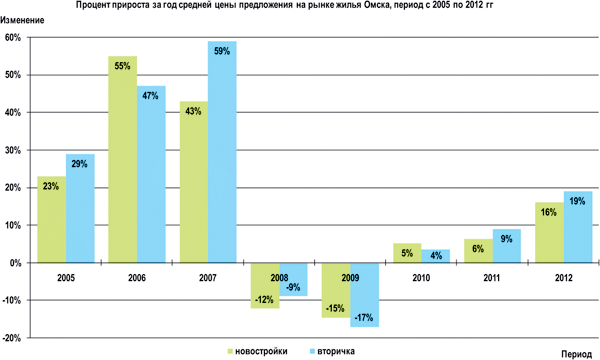 Процент прироста за год средней цены предложения на рынке жилья Омска, период с 2005 по 2012 гг