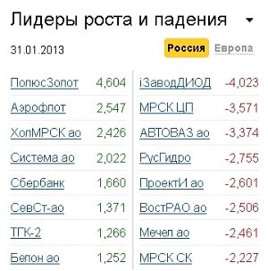 31 января ряд отечественных энергетических компаний опубликовали результаты своей операционной деятельности. В частности, отчет представил лидер вчерашних торгов - "РАО ЭС Востока". За 2012 год компания увеличила выработку электроэнергии на 4%, а отпуск тепла вырос на 3%. Неплохие цифры не смогли оказать ощутимой поддержки бумагам эмитента, которые в течение дня несли ощутимые потери. В результате снижение относительно уровней вчерашнего закрытия составило 2,51%.