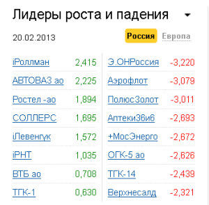 В лидерах рынка по итогам дня оказались бумаги "АВТОВАЗа" (+2,22%), "Ростелекома" (+1,89%), "СОЛЛЕРСа" (+1,69%), ВТБ (+0,7%). Среди аутсайдеров обозначились бумаги "Аэрофлота" (-3,07%), "Полюс Золото" (-3,01%), "Аптечной сети 36и6" (-2,69%), "Мосэнерго" (-2,67%), ТГК-14 (-2,43%), "ВСМПО-АВИСМА" (-2,32%).