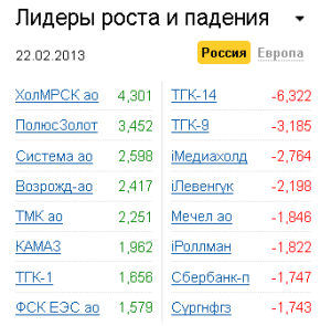 Лучше всех выглядели бумаги "Полюс Золото" (+3,45%), которые выросли на новостях о продаже группой "ОНЭКСИМ" своей доли в Polyus Gold International. Также на положительной территории смогли закончить день акции "Холдинга МРСК" (+4,3%), АФК "Система" (+2,59%), банка "Возрождение" (+2,41%), "КАМАЗа" (+1,96%), "ФСК ЕЭС" (+1,57%).