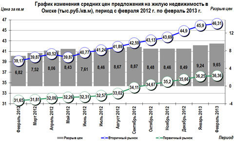 По данным журнала "Недвижимость", средняя цена квадратного метра жилья на вторичном рынке на конец февраля 2013 года составила 46 тысяч 310 рублей, за неделю она прибавила 90 рублей (+0,2 %).