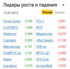 Лучше остальных выглядели акции "Полюс Золото" (+5,1%) благодаря информации о включении акций Polyus Gold в состав индексов FTSE Global Equity и FTSE All World Equity после закрытия торгов 15 марта 2013 года. Также среди лидеров роста значились бумаги "ПРОТЕКа" (+2,65%), "СОЛЛЕРСа" (+1,9%), "Сургутнефтегаза" (+0,89%), "Холдинга МРСК" (+0,79%), "Газпрома" (+0,48%).