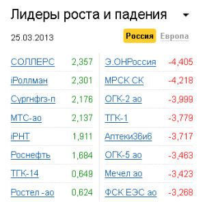 Банковские "фишки" в целом торговались наравне с рынком: "Сбербанк" по итогам дня просел на 0,67%, ВТБ - на 1,77%. Бумаги банка "Возрождение" (+1,42%) чувствуют себя значительно лучше рынка в преддверии публикации финансовой отчетности по МСФО, запланированной на 27 марта. Также смогли устоять под натиском вечернего негатива бумаги "СОЛЛЕРСа" (+2,36%), обыкновенные акции МТС (+2,14), акции "Роснефти" (+1,68%), "МегаФона" (+1,32%), "Ростелекома" (обыкн. +0,62%, "префы" +0,27%), "КАМАЗа" (+0,23%). Среди лидеров падения отметились такие бумаги как "Мечел" (-5,7%), "ФСК ЕЭС" (-3,27%), "Аэрофлот" (-2,65%), "РусГидро" (-2,15%), ММК (-2,05%), ГМК "Норникель" (-2,02%), "Русал" (-1,87%).