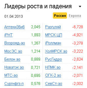 В лидерах торгов были заметны акции "Аптечной сети 36,6" (+2,04%), банка "Возрождение" (+1,27%), "Мосэнергосбыта" (+1,21%), "Белона" (+0,88%), "НОВАТЭКа" (+0,72%), МТС (+0,69%).