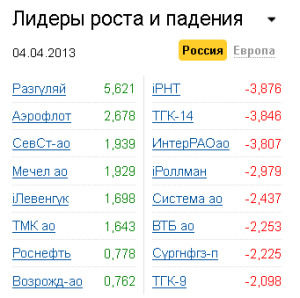 Также среди лидеров роста отметились такие бумаги как "Мечел" (+1,78%), "Северсталь" (+1,43%), "Роснефть" (+1,09%), ТМК (+1,05%), "Сбербанк" (+1,05%). Хуже рынка выглядели бумаги "Распадской" (-2,89%), "АВТОВАЗа" (-2,39%), "Белона" (-2,2%), "ИНТЕР РАО ЕЭС" (-2,54%).