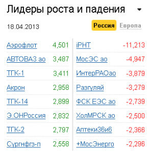 Лучше остальных торговались и акции "Аэрофлота" (+4,5%), "АВТОВАЗа" (+3,48%), ТГК-14 (+2,89%), ГМК "Норникель" (+1,61%), "РАО ЭС Востока" (+1,47%).