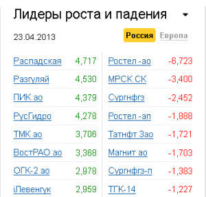 Лучше рынка выглядели акции ряда компаний энергетического сектора, которые после сильного снижения за последний месяц выглядят привлекательными для покупок: "РусГидро" (+4,28%), "РАО ЭС Востока" (+3,37%), ОГК-2 (+2,98%), "ФСК ЕЭС" (+1,9%). Акции последней поддержала неплохая отчетность по МСФО за 2012 год: выручка компании выросла на 0,5% г/г до 140,3 миллиарда рублей, чистая прибыль, правда, при этом снизилась на 22% до 29,96 миллиарда рублей. В лидерах роста во вторник также оказались акции ГК "ПИК" (+4,38%), которые продолжают рост на фоне опубликованных вчера операционных данных за 1 квартал года. Несмотря на слабую китайскую статистику, неплохо смотрелись акции российских металлургов: НЛМК (+2,08%) и "Северстали" (+1,4%). "Норникель" (-1,18%) при этом торгуется хуже рынка, что аналитики объясняют понижением рекомендаций по ГДР компании со стороны Morgan Stanley. Свое снижение приостановили акции "Газпрома" (+0,23%): несмотря на недавнее снижение дивидендов, доходность по его бумагам составляет 5%, отмечает ведущий аналитик "Газпромбанка" Андрей Клапко.