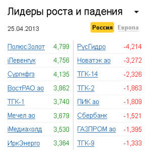 В лидерах рынка были заметны бумаги "Полюс Золото" (+4,8%), "Сургутнефтегаза" (+4,13%), "РАО ЭС Востока" (+3.86%), ТГК-1 (+3,74%), "Мечела" (+3,68%). В аутсайдерах остались "РусГидро" (-4,21%), "НОВАТЭК" (-3,27%), ТГК-14 (-2,32%), ТГК-2 (-1,86%), "Сбербанк" (-1,52%), "Газпром" (-1,39%).