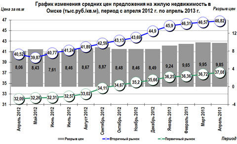 По данным журнала "Недвижимость", средняя цена квадратного метра жилья на вторичном рынке на конец апреля 2013 года составила 46 тысяч 820 рублей, за неделю она прибавила 120 рублей (+0,3 %).