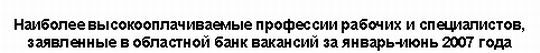 В Омской области самыми высокооплачиваемыми профессиями, включенными в банк вакансий, являются рабочие специальности. Лидерами по уровню предлагаемых зарплат в первом полугодии 2007 года стали машинист трубоукладчика, начальник узла (радионавигации и радиолокации, связи), начальник планово-производственного отдела, заместитель начальника по строительству и прораб. Наивысшим спросом пользуются литейщики, ремонтники вагонов, инженеры, мастера, токари, электромонтажники.