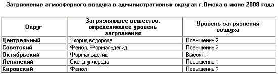 Почти во всех округах Омска в июне отмечено повышенное загрязнение воздуха. В Октябрьском округе специалисты отметили высокий уровень загрязнения. Городской воздух более всего загрязнен хлоридом водорода, фенолом, оксидом углерода, формальдегидом.