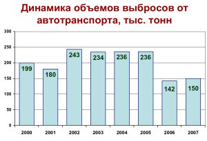 За последние 15 лет объем выбросов вредных веществ от стационарных источников сократился в 2,4 раза - с 401 тысячи тонн до 169 тысяч. Как рассказал Ринат Валитов, основная причина снижения выбросов - перевод энергетических установок на природный газ и модернизация технологических процессов. Однако, выбросы автотранспорта составляют почти половину всех суммарных выбросов вредных веществ - 150 тысяч тонн (46% - по итогам 2007 года). По словам Валитова, сегодня лишь 7% из более 14 тысяч автомобилей эксплуатируется с превышением уровня СО в выхлопных газах. Для сравнения, в 1994-1996 годах "с превышением" ездил каждый четвертый.