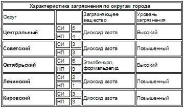 Воздух города более всего загрязнен этилбензолом, диоксидом азота и формальдегидом. В Центральном и Советском округах зарегистрированы единичные случаи превышения ПДК диоксида азота и формальдегида, в Ленинском и Кировском - диоксида азота, в Октябрьском - пыли, оксида углерода, диоксида азота, формальдегида, ксилола и этилбензола.