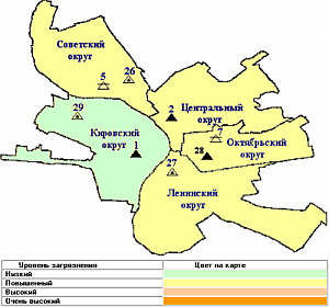 В минувшем месяце в целом по городу уровень загрязнения воздуха был повышенным. Воздух города более всего загрязнен бензолом, сажей и фенолом. Случаи высокого и экстремально высокого загрязнения атмосферного воздуха не зарегистрированы. Единичные случаи превышения ПДКм.р. отмечены в Октябрьском округе - по саже, формальдегиду, бензолу и толуолу, в Советском - по бензолу, в Центральном - по фенолу, в Ленинском – по саже.