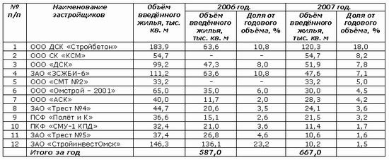 В 2007 году половина нового жилья в Омске построена шестью крупнейшими компаниями. Двенадцать застройщиков города сдали за год 667 тысяч квадратных метров жилья. Ввод в эксплуатацию 18% годового объема жилья - более 120 тысяч квадратных метров - обеспечило ООО ДСК "Стройбетон".