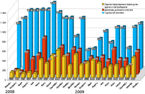 По данным УФРС, в октябре 2009 года отмечен рост числа сделок с жилой и нежилой недвижимостью, а также с землей. Из 30982 зарегистрированных сделок 12707 договоров приходится на жилье, 2643 - на нежилые помещения, 8878 сделок совершено с землей. Для сравнения, в сентябре было заключено 11836 сделок с жильем, 2557 - с нежилыми помещениями, 8958 - с землей.