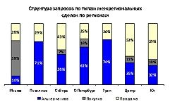 Почти 40% в структуре запросов по жилой недвижимости – это обмен или альтернативные сделки (человек продает одну квартиру и покупает другую). Менее 20% приходится на приобретение новой квартиры без продажи имеющейся (в основном такие покупки совершали жители Московского региона). В Сибири таких запросов 7%, в Центральном регионе - 11%, в Поволжье и на Урале запросов на прямую покупку жилья в другом регионе вовсе нет.