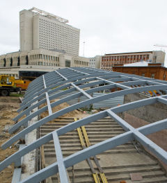 Как сообщили в пресс-службе компании, сейчас строители приступили к монтажу металлоконструкций куполообразных павильонов, которые будут установлены над каждым из лестничных сходов. По замыслу архитекторов НПО "Мостовик", металлические конструкции павильонов будут окрашены в золотисто-бронзовый цвет, который активно используется в рамах окон и витражей находящихся рядом зданий.