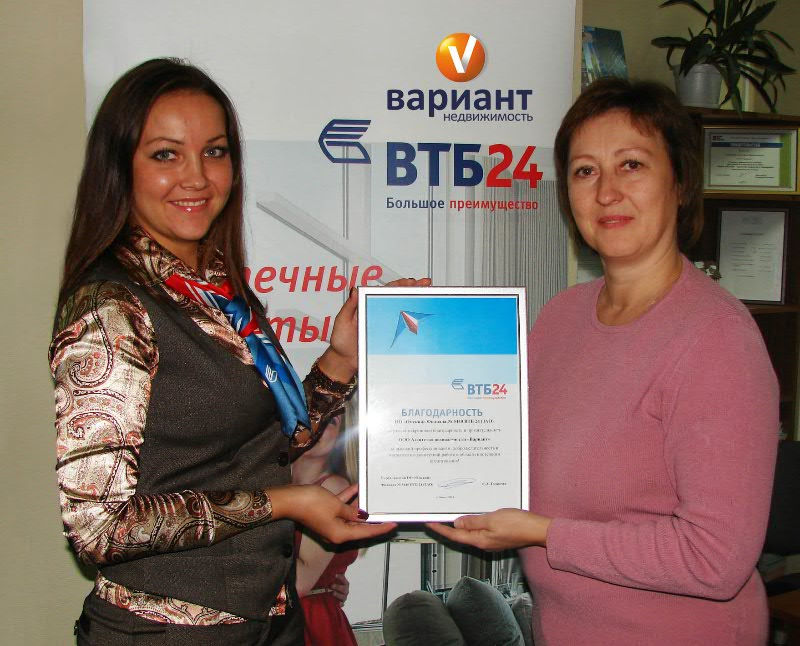 В октябре на встрече представителей банка ВТБ24 и агентств недвижимости отличная работа нашего ипотечного специалиста Людмилы Александровны Днепровской отмечена благодарностью Банка ВТБ24.