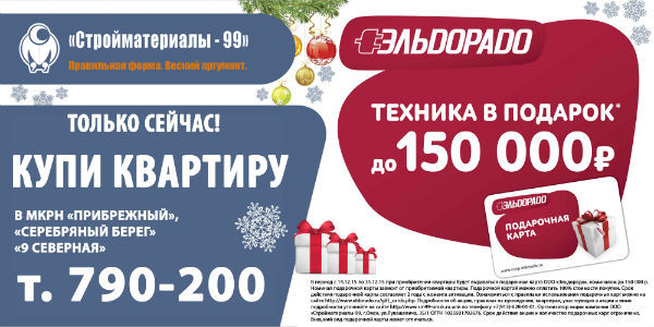 Компания "Стройматериалы-99" поздравляет всех омичей с Новым Годом и Рождеством и готовит для своих клиентов сюрприз. Купив квартиру любой площади в микрорайонах «Прибрежный», «Серебряный берег» и « 9 Северная», омичи получат подарочную карту от магазина техники "Эльдорадо"на сумму до 150 000 рублей!