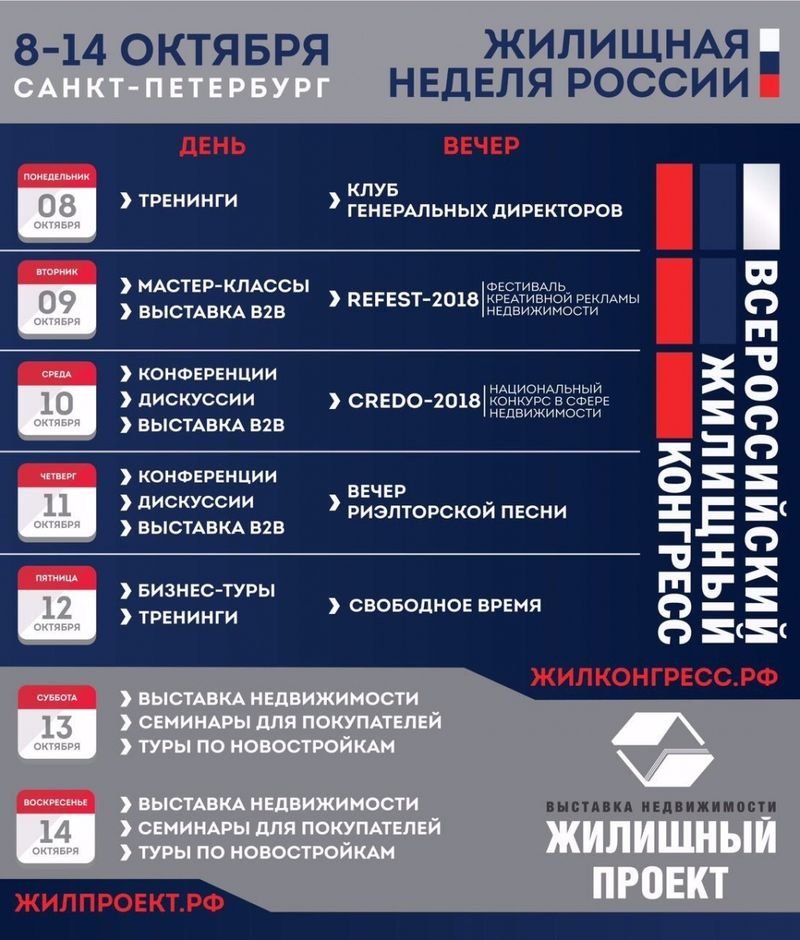 Жилищная неделя стартует 8 октября. В этот день начнет свою работу Санкт-Петербургский Всероссийский жилищный конгресс – крупнейшее мероприятие рынканедвижимости формата B2B в России. Конгресс соберет рекордное число участников - около 3 тысяч профессионалов из России и 25 зарубежных стран. В рамках Конгресса будет проведено около 400 мероприятий, которые охватят буквально все аспекты рынка недвижимости. Прозвучит свыше 500 докладов. Состоятся более 60 мастер-классов и тренингов от ведущих бизнес-тренеров и практиков рынка недвижимости.