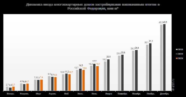 В июле застройщиками введено 2,5 млн кв. м многоквартирных домов, что на 23,8 % или на 0,8 млн кв. м меньше чем за аналогичный период 2019 года. Эксперты отмечают, что отставание от темпов ввода многоквартирных домов застройщиками по отношению к предыдущему году наблюдается уже четвертый месяц подряд.